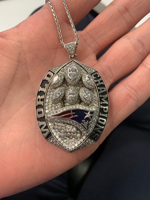 He snagged this from her last night. The cheerleaders got these from team instead of rings...