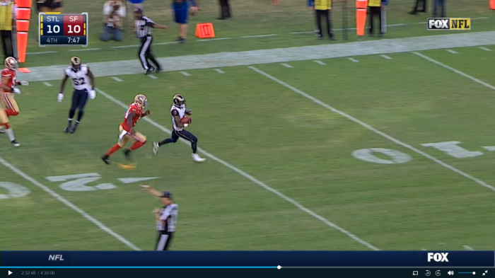 Amid the chaos and flying flags of the Tavon Austin punt return, everyone was focused on Tavon's left foot which was pretty close to the sidelines but clearly not out. This picture shows the closest Tavon came to going out of bounds. The (blind?) ref clearly should have swallowed his whistle because this was not a 100% certain thing, and blowing his whistle killed the play at that moment. 2nd time this game that a ref who did NOT swallow his whistle cost the Rams a huge play, very frustrating.